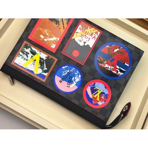 Cette saison, la toile Pochette Voyage en graphite Damier est complétée par des patchs emblématiques arborant des signatures de maisons sur des images colorées des Alpes. Cette pochette intelligente et structurée est suffisamment grande pour contenir un ordinateur portable et contient une poche et des emplacements pour cartes de crédit. Il peut être porté à la main ou glissé dans un sac plus grand.