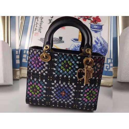 DIOR LADY DIOR EN CUIR DE VEAU NOIR GAUFRÉ À LA CHALEUR AVEC PEINTURE À LA MAIN M0759