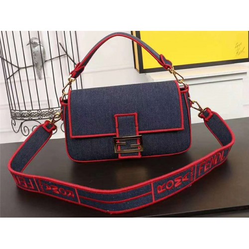Sac Baguette Fendi grand format en denim bleu et rouge