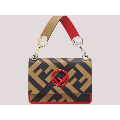 Sac avec rabat et nouveau logo Fendi. Fermoir magnétique. Poche intérieure. Il peut être porté en bandoulière ou porté à la main grâce à la bandoulière amovible. Fabriqué en cuir de veau noir avec un design macro FF entièrement encastré dans des tons de marron. Bords et détails en cuir rouge. Articles en métal dans une combinaison de finitions palladium et or.