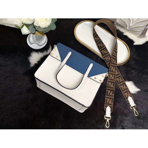 Sac fourre-tout moyen. La double poignée, avec rabat qui se plie sur les côtés, permet de porter le sac à la main, ou de le porter sur l'épaule ou en bandoulière grâce aux bretelles amovibles. Doublure avec poche plate. Fabriqué à partir d'un mélange de cuir de veau beige et bleu foncé. Décoré de micro clous plats. Bandoulière ruban avec motif FF. Articles en métal finition dorée.