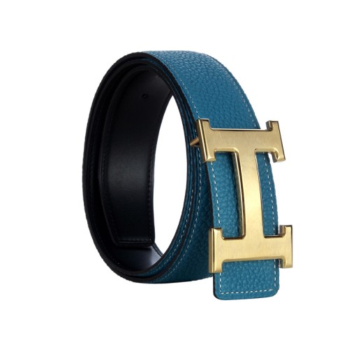 Ceinture Hermès en cuir Togo avec boucle H dorée, bleue et noire.