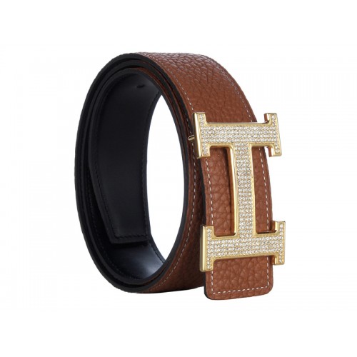 Ceinture Hermès en cuir Togo marron avec boucle H dorée et monture diamant