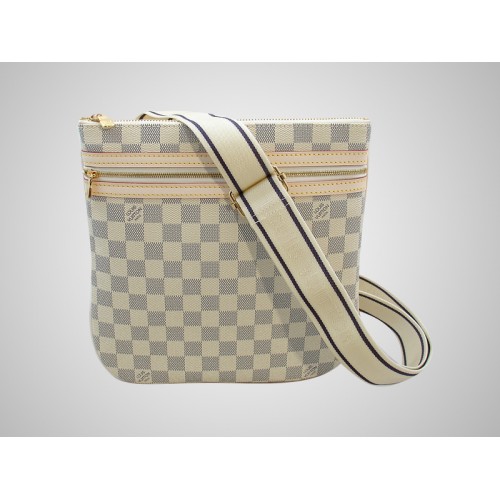 Louis Vuitton présente une pochette plate légère et pratique en toile Damier Azur, parfaite pour une utilisation en ville ou en voyage. Une poche avant zippée offre un accès pratique à votre téléphone portable, iPod ou autres accessoires tandis que le compartiment principal zippé contient tous vos essentiels quotidiens ou de voyage.