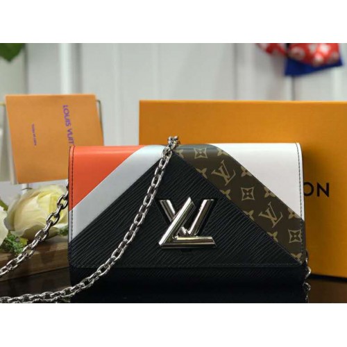 Le portefeuille à chaîne Twist reçoit un nouveau look audacieux pour l'animation Twist Graphic Tape. Des blocs de cuir coloré sont juxtaposés à une bande à motif Monogram grâce à des techniques uniques de travail du cuir. Ce portefeuille, qui peut également être porté comme un petit sac à bandoulière, présente l'emblématique verrouillage à rotation LV de la ligne Twist.