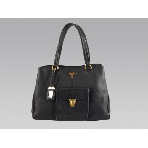 Sac cabas Prada en cuir de vachette noir, format moyen, avec poche avant