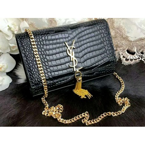 Saint Laurent Kate Medium avec pompon en cuir de crocodile brillant noir